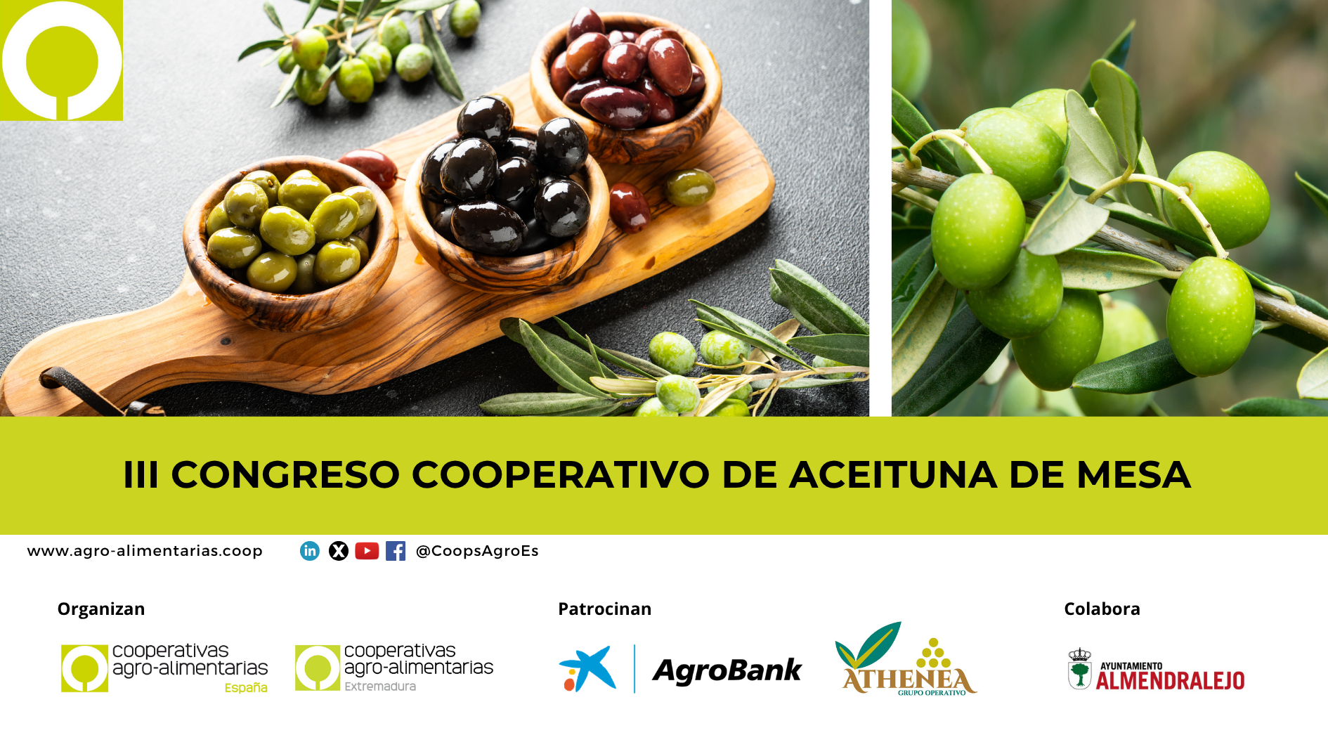 Cooperativas Agro-alimentarias Extremadura y Cooperativas Agro-alimentarias de España celebran el próximo 5 de mayo de 2026, en Almendralejo (Badajoz), el III Congreso Cooperativo de Aceituna de Mesa. Un encuentro que reunirá a cooperativas y técnicos de Extremadura y Andalucía, junto a investigadores y representantes institucionales para analizar los principales retos y oportunidades del sector.